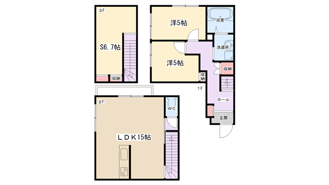 | 間取り内訳 | 洋室5帖・洋室5帖・LDK15帖・S6.7帖 | 駐車場 | 敷地内あり 6,000円 | ||||