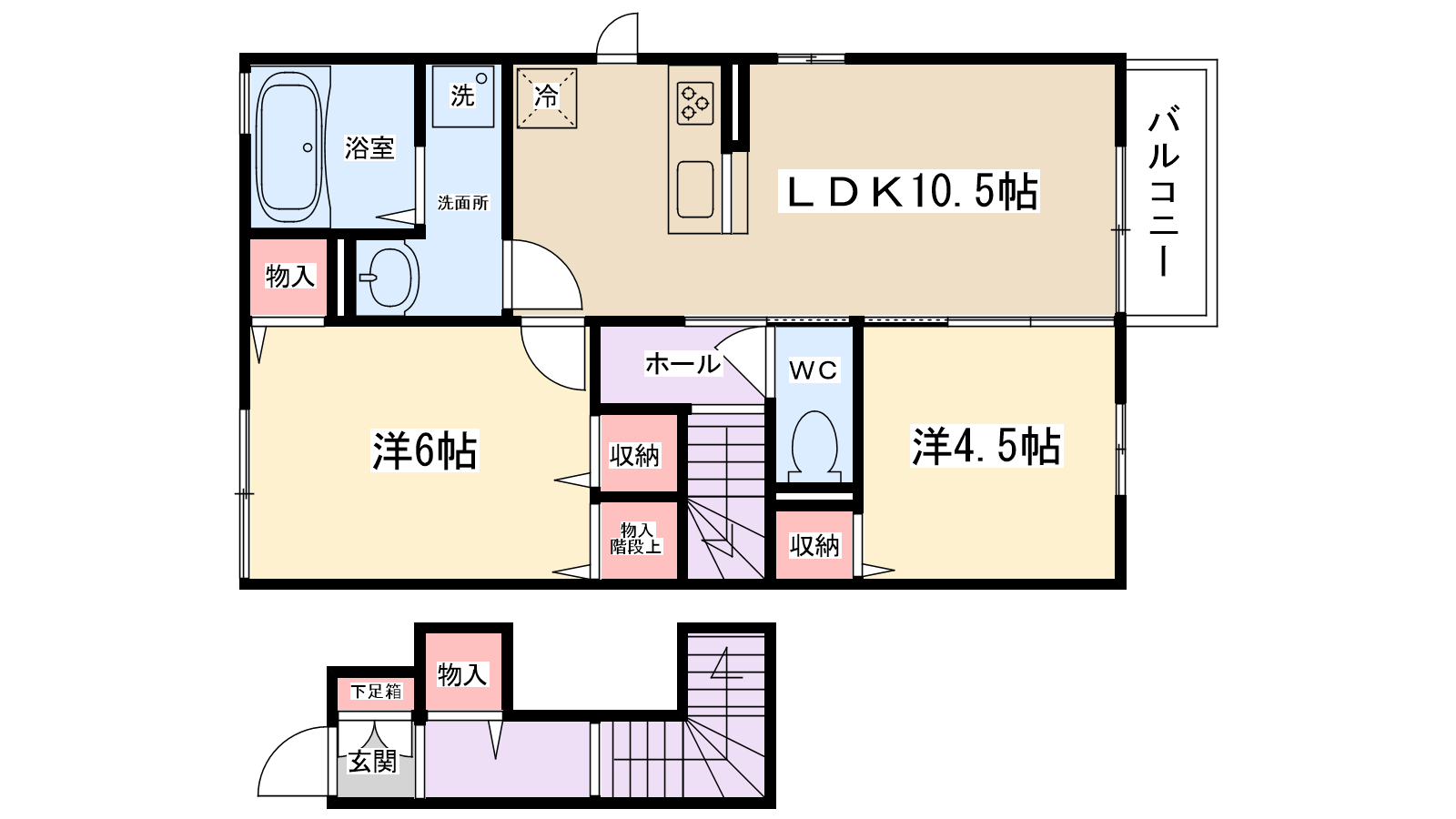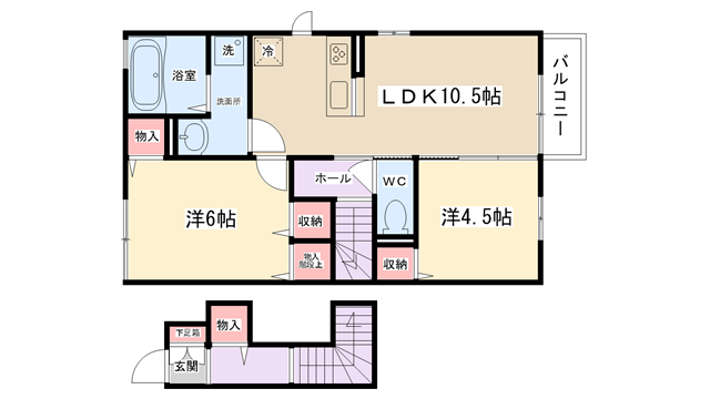 | 間取り内訳 | LDK10.5帖・洋室6帖・洋室4.5帖 | 駐車場 | 敷地内あり 7,700円 | ||||