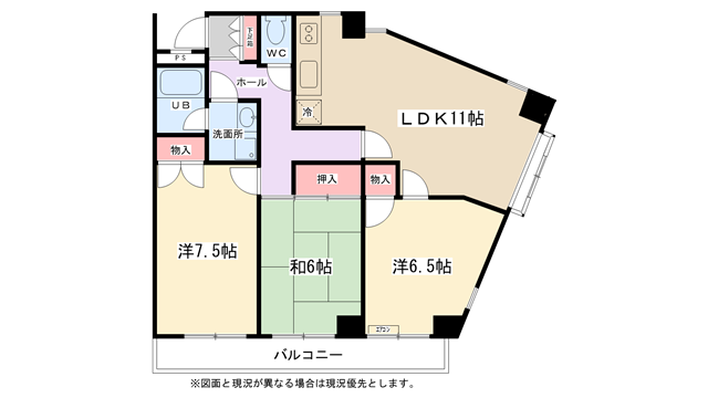 | 間取り内訳 | 洋室6.5帖・洋室7.5帖・和室6帖・LDK11帖 | 駐車場 | 近隣あり 9,000円 | ||||