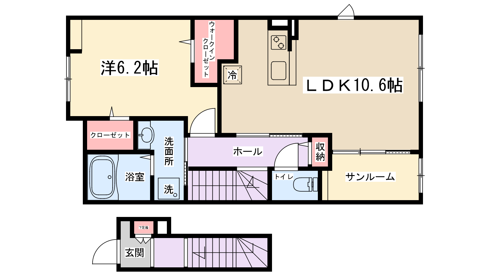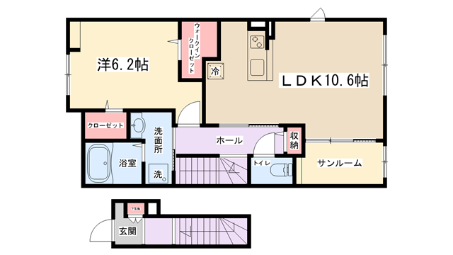 | 間取り内訳 | LDK10.2帖・洋室6.2帖 | 駐車場 | 敷地内あり 7,700円 | ||||