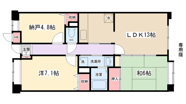 | 間取り内訳 | LDK13帖・洋室7.1帖・和室6帖・S4.8帖 | 駐車場 | 敷地内あり 8,800円 | ||||