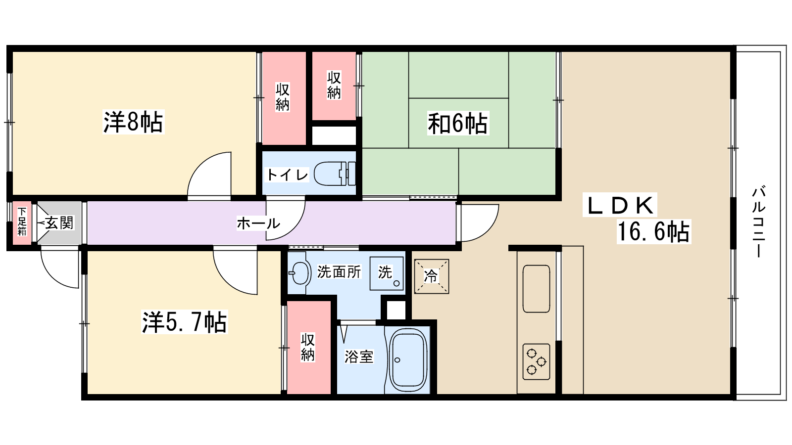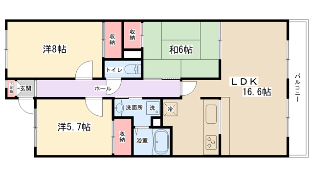 | 間取り内訳 | LDK16.6帖・洋室8帖・和室6帖・洋室5.7帖 | 駐車場 | 敷地内あり 11,000円 | ||||