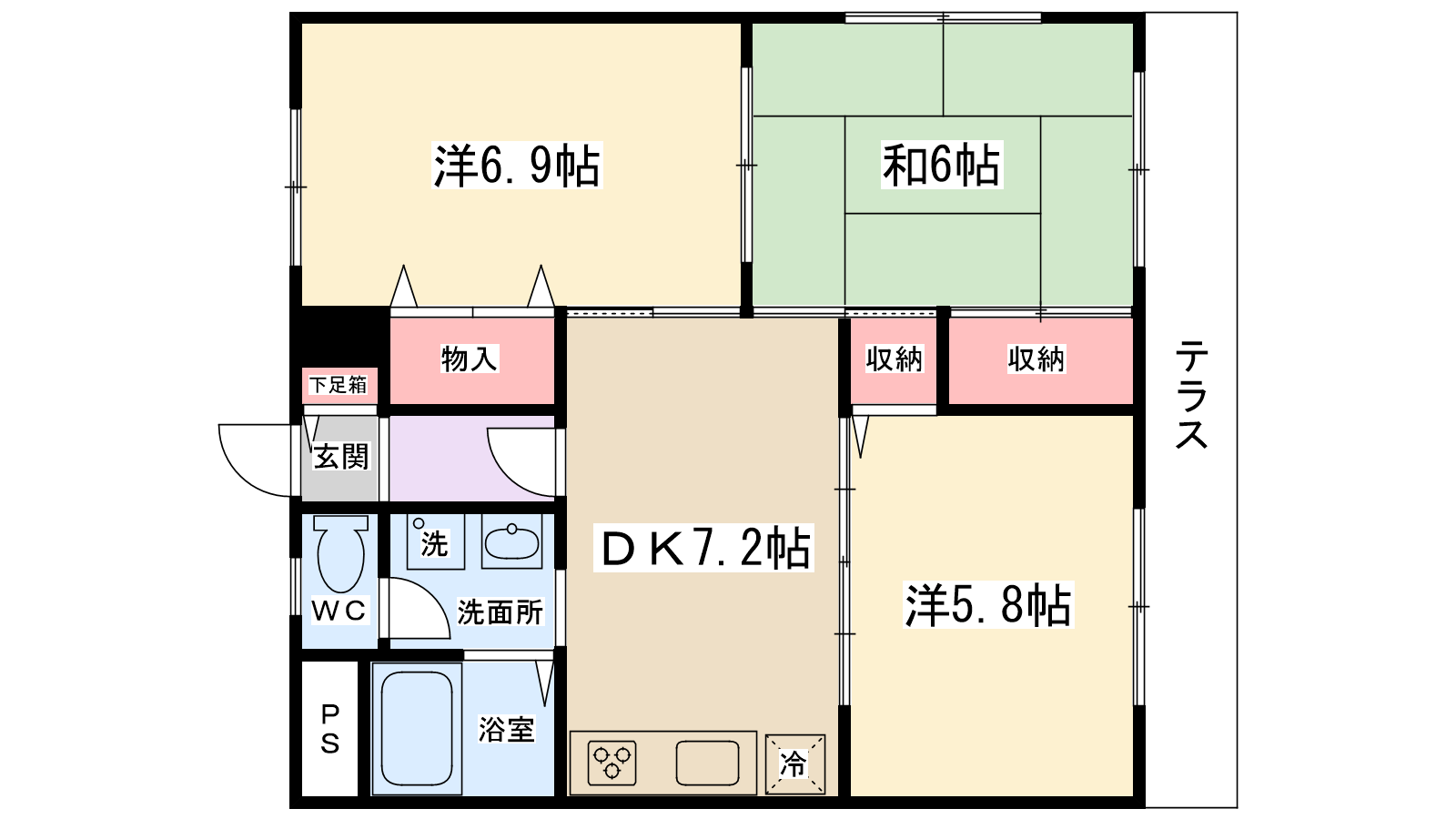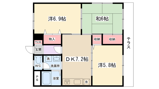 | 間取り内訳 | DK7.2帖・洋室5.8帖・洋室6.9帖・和室6帖 | 駐車場 | 敷地内あり 11,000円 | ||||