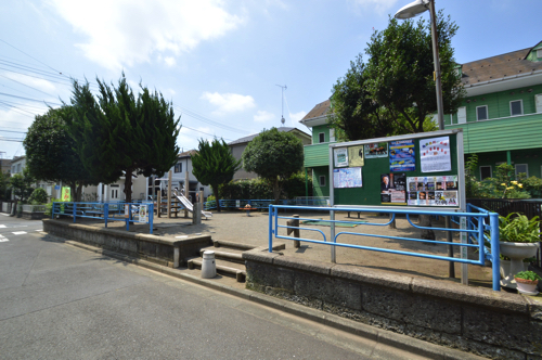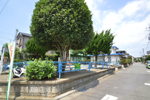住宅街のなかに公園があります。大きな木が数本あり、緑が綺麗です。