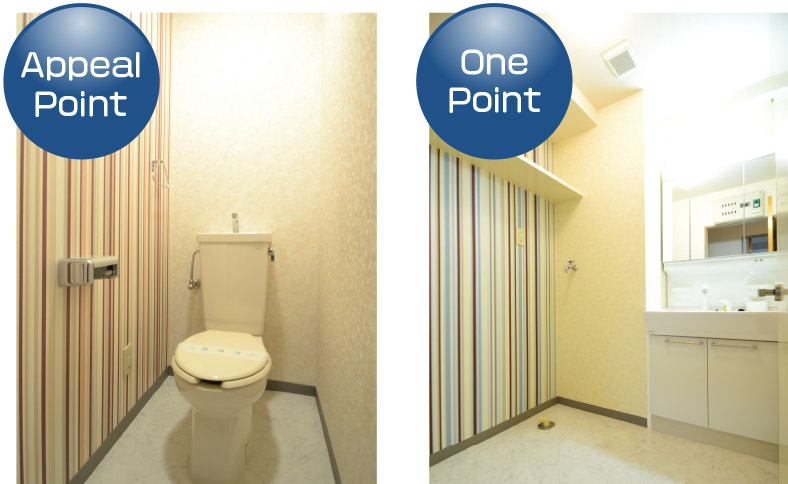 2.トイレ、洗面所の壁一面にデザインクロスを貼りワンポイントアピール