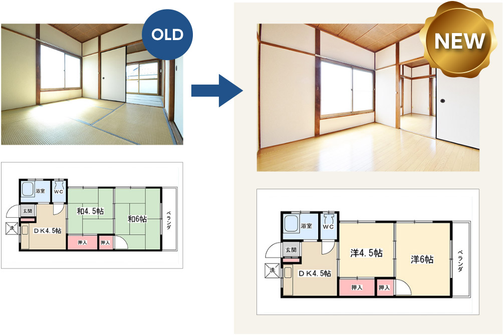 工事の内容により、ご負担いただく費用が大きくなる場合もございますが、空室削減のためには需要に合ったお部屋作りが何よりも大切なため、 オーナー様へご提案をさせていただく場合もございます。弊社で行っている施工例をご紹介させていただきます。