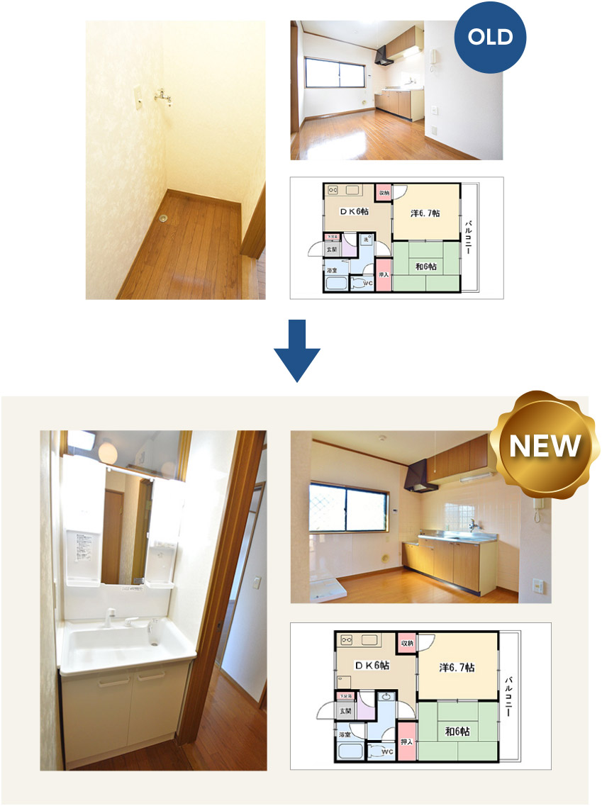 施工例をいくつかご紹介いたしましたが、リノベーションを行うにあたって、最も大切なことは、費用対効果を考えていくことです。 大規模なリノベーション物件は、賃料アップを見込めますが、その募集賃料と工事代金のバランスを考えることは重要です。 工事代金が高額になればなるほど、賃料をできるだけアップしたいと考えるのは当然のことですが、その賃料でお部屋が決まらない状況になってしまうと問題が生じます。 弊社は、工事前にオーナー様と事前にしっかりと打ち合わせをし、工事をどこまでやるべきか、賃料はいくらで募集するかを決定しております。 また、どういったことを手掛ければお客様の注意を引けるかをご提案の上、ご相談させていただきます。オーナー様と共に歩んでいける賃貸経営を常に目指しております。