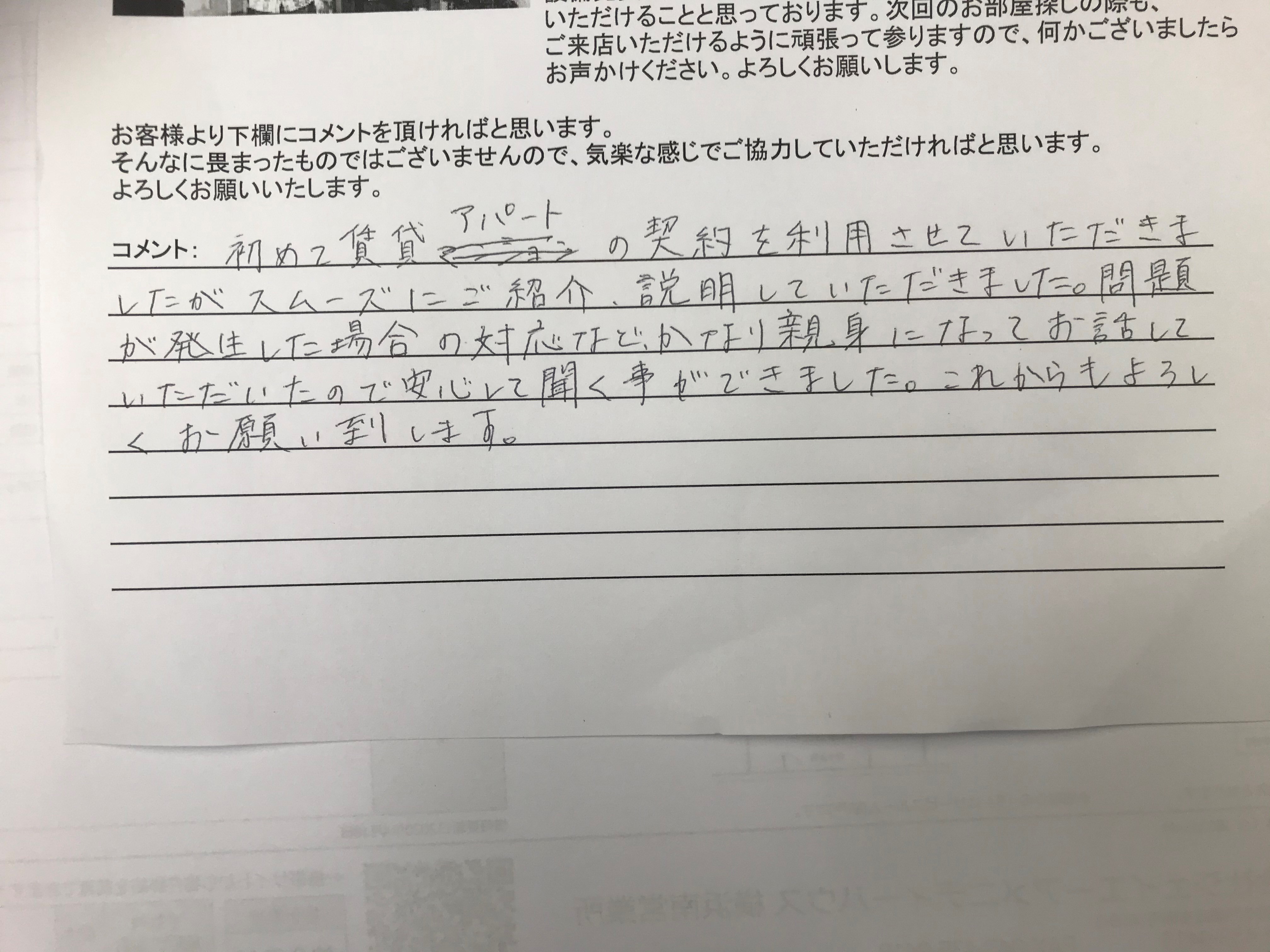 初めて賃貸アパートの契約を利用させて頂きましたがスムーズにご紹介、説明していただきました。問