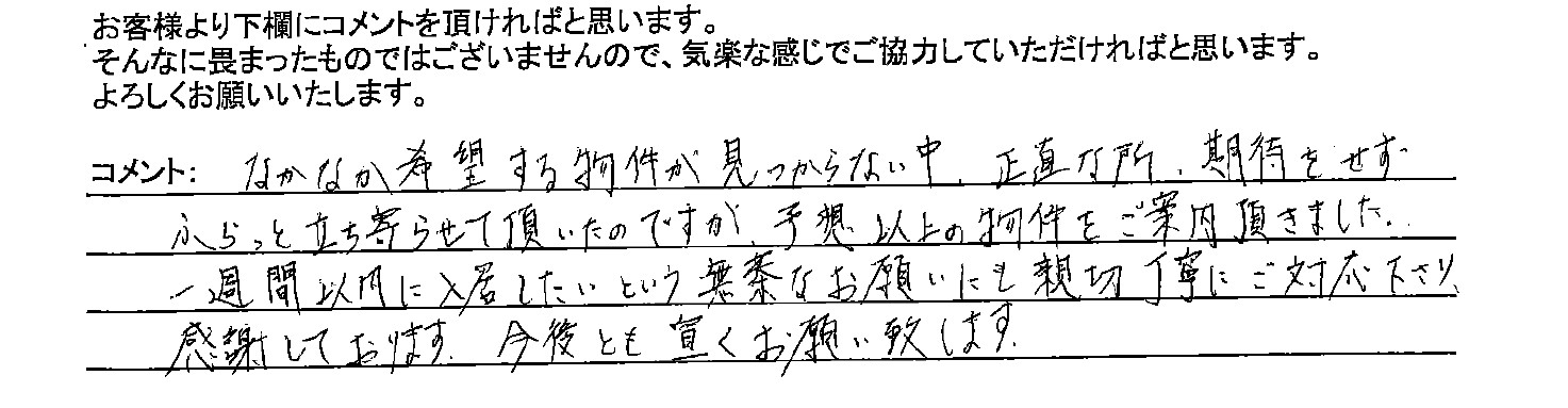 初めてのお部屋探しでしたが、わかりやすくご説明していただき、とても助かりました。希望通りの物